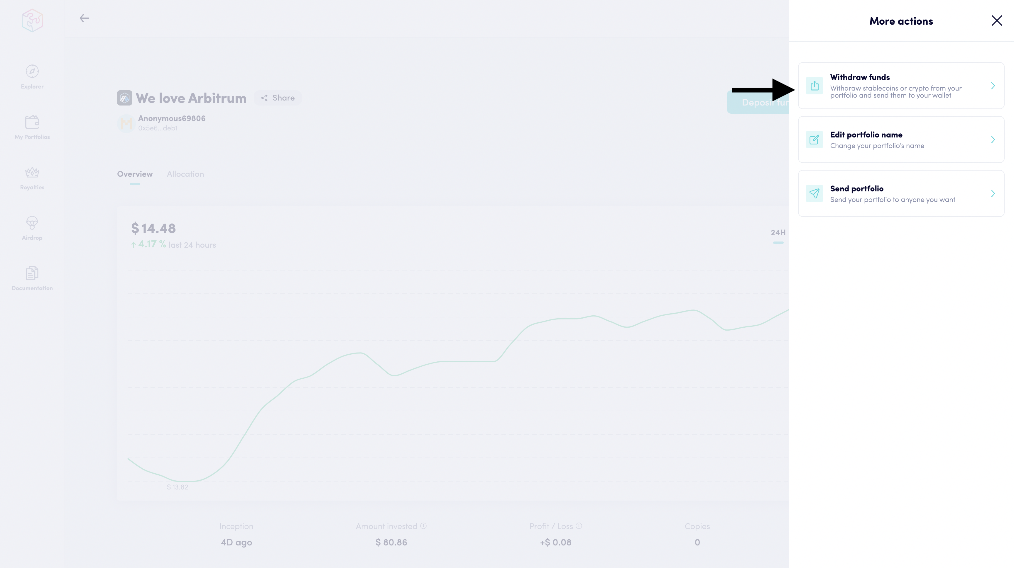 Set an amount/percentage of your portfolio you want to sell and withdraw. Once the amount is set, you can confirm and wait for the operation to be confirmed.